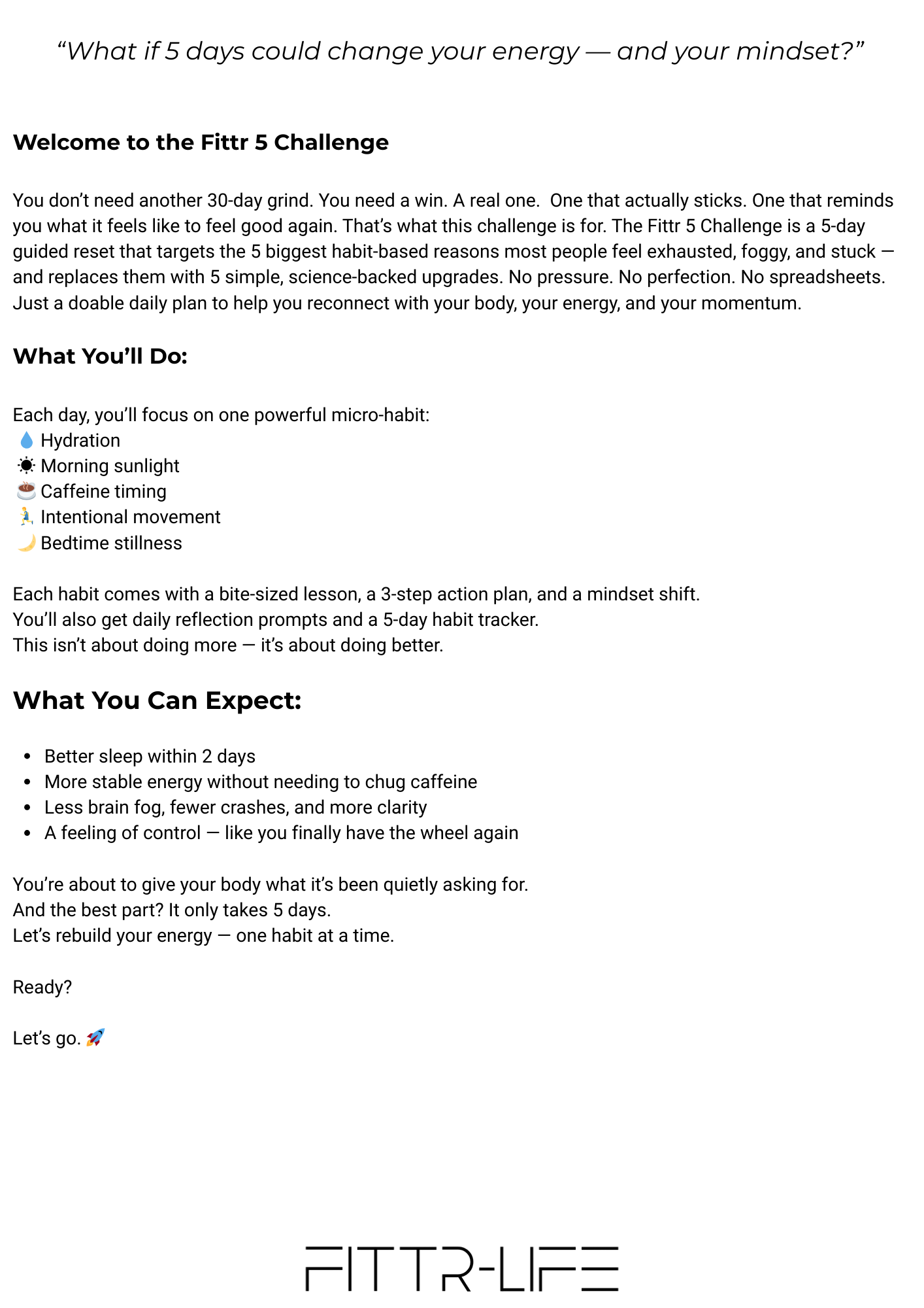 The Fittr 5 Challenge is a quick, science-backed reset that replaces 5 energy-draining habits with high-impact, feel-good routines. All in under 15 minutes a day.